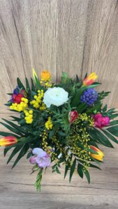 Frühlingserwachen ist ein rundgebundener Blumenstrauß voller Leichtigkeit und Lebensfreude – in einer frischen, bunten Farbharmonie wie ein erster sonniger Frühlingstag. Zarte Ranunkeln, farbenfrohe Tulpen, duftige Freesien, Hyazinthen und elegante Anemonen sorgen für ein lebendiges Blütenbild mit viel Struktur und Charme.